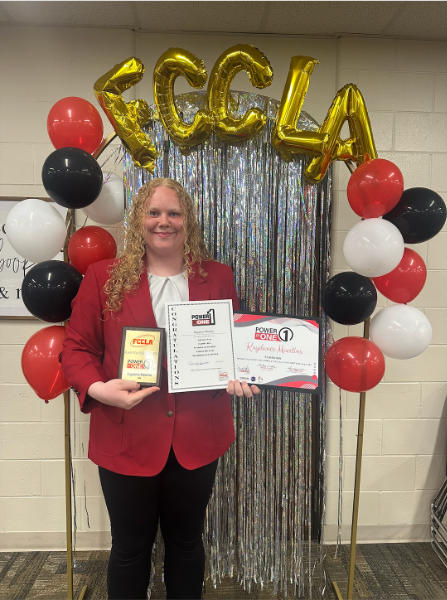 Adviser Mrs. Jacobsen and Officer Jaden May presented the Power of One Awards to members who completed goals within each module that they had set for themselves and worked to achieve this year. Members received a certificate for each module they completed this year with the goal to complete all 5 units by their senior year. Receiving certificates this year in the following modules were “Better You”: Chloe Keminitz, Scarlet Torrey, Payton Johansen, Kaydance Maertins, Dakotah Albin, Landon Hergert, and Ashlyn Forbes”; “Working on Working”: Ilyana Barron, Landon Hergert, and Ilyana Barron”, “Speak Out for FCCLA”: Kaydance Maertins, Dakotah Albin, and Jaden May; “Family Ties”: Ilyana Barron; “Take the Lead”: Dakotah Albin, Jaden May, Landon Hergert, Ashlyn Forbes. Receiving a certificate and plaque for having completed all five units this year was senior member Kaydance Maertins.