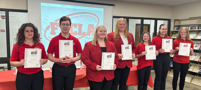 Officer Dakotah Albin presented the STEP One Certificates to new members Payton Johansen, Denise Murphy, Damiana Strong, Landon Hergert, Chole Mullins, Lucea Miller, Alina Hilpipre, Elena Camacho, Chloe Kemnitz Connor Montogomery, Nyome Barron, and Erica Maurer. They earned this award by completing the STEP One Program where they learned about FCCLA, its purposes, and programs.
